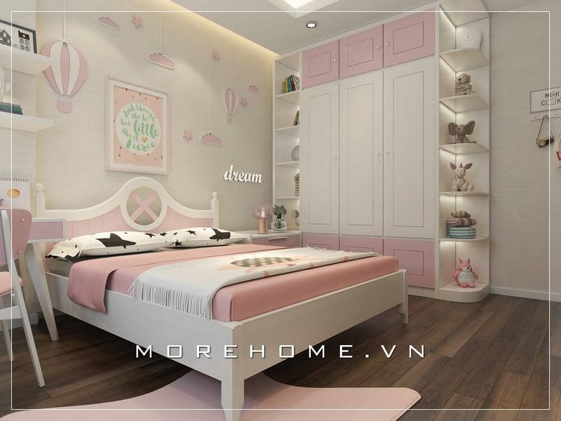 Để thỏa mãn sở thích của bé gái và đáp ứng được nhu cầu của cô trong quá trình nghỉ ngơi sinh hoạt, phòng ngủ của bé được trang trí nội thất ấn tượng.