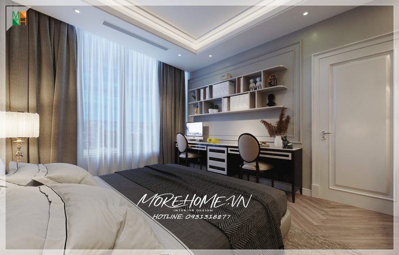 Không gian học tập trong phòng ngủ được chú trọng đến, do đó các kiến trúc sư Morehome đã thiết kế một mẫu bàn làm việc từ gỗ có hai màu đen và trắng kết hợp hiện đại.